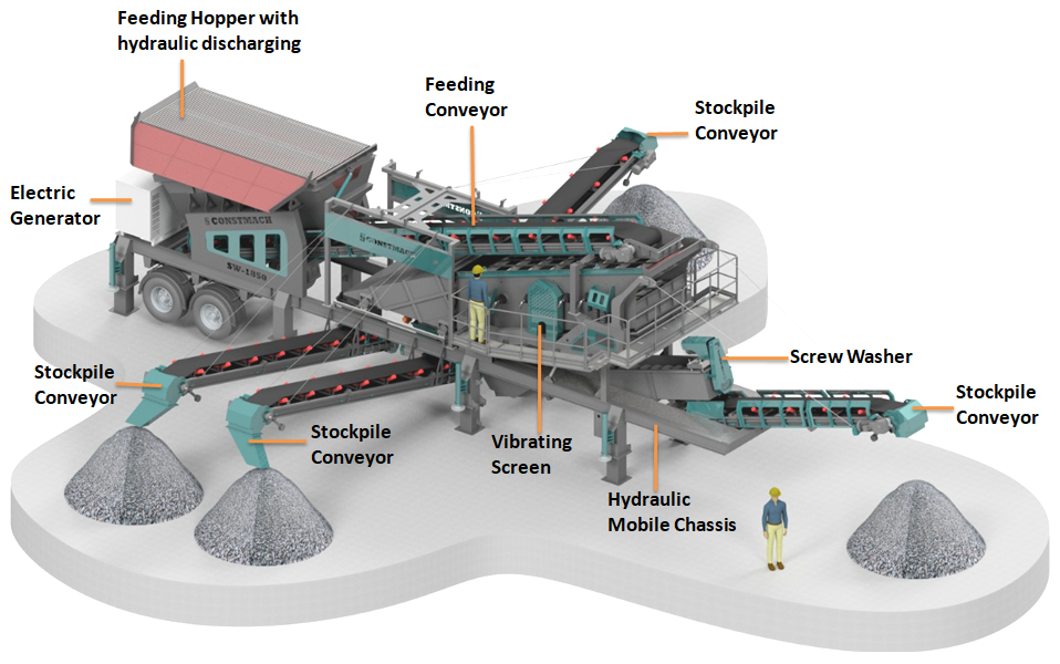 CONSTMACH SW Series Mobile Screening & Washing plants are used for natural screening and washing of sands and gravels. The biggest advantage of our mobile screening and washing plants is easy mobility, quick installation and relatively smaller land requirements. All the necessary equipment for the screening and washing process is combined on a single-wheeled chassis.
