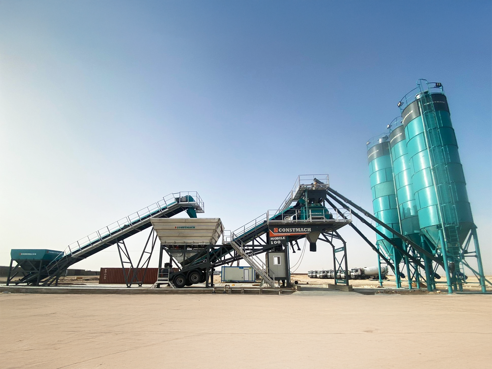 CONSTMACH MOBILE 100 الكامل التلقائي لخلط الخرسانة المتنقلة هو الحل المناسب للاحتياجات المؤقتة ولكن القدرة الإنتاجية العالية مع ميزاته للتثبيت السريع ، وميزة بدء الإنتاج في وقت قصير والحد الأدنى من ضرورة البنية التحتية. يتميز مصنع الخرسانة المتنقلة MOBILE 100 بميزات القدرة على الحصول على جميع المعدات اللازمة لإنتاج الخرسانة ، حتى صوامع الأسمنت تقع على هيكل متحرك بعجلات واحدة ، وهذا يوفر سهولة النقل ومزايا التثبيت السريع لمستخدميها.
