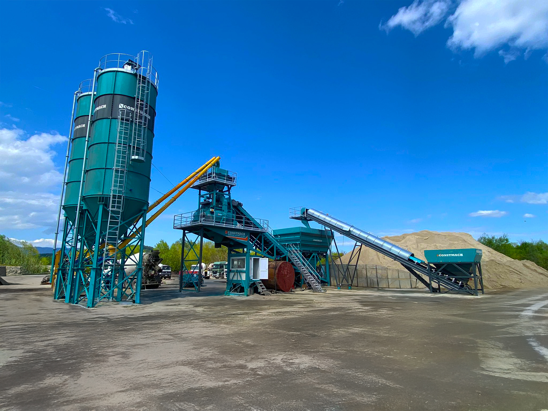 La planta mezcladora de hormigón tipo móvil CONSTMACH MOBILE 100 requiere una preparación mínima del sitio. Basta con un terreno plano que sea capaz de soportar la carga total de la planta. Los silos de cemento que se montan en el chasis de las plantas móviles tienen una capacidad de almacenamiento de 33 toneladas. En caso de necesidad, también se pueden utilizar silos de cemento externos que tienen una capacidad de almacenamiento de 50 a 500 toneladas. Los silos de cemento de tipo externo siempre tienen patas de acero completas para eliminar la necesidad de construcción de patas de hormigón.